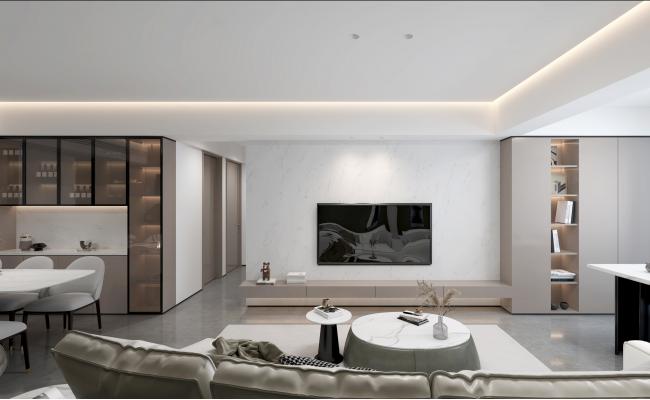事物都由一個完整體系構成,分配成無數單獨的分支,以多維度的視角去分析和對待,初看時或許毫無關聯的兩條路,在某個分叉口又合并起來。就像繪畫和設計,看似迥然不同的兩條路,最后卻殊途同歸,呈現出別致高級的空間效果。 從《十面靈璧圖》中汲取靈感,以畫作主題“非非石”之色作為空間主色調,沉穩簡潔的灰+白的配色,讓居室呈現出大氣恢宏的氣度。考慮到房屋原始結構中存在高低差,設計臺階將空間串聯起來,原本穩重靜止的空間多了動感之勢,一步一景,以巧妙的設計手法探索空間不同角度的認知。“晚明四大家”之一的邢侗評《十面靈璧圖》為“巖壑奇姿”,以此為靈感設計的空間,也應有“巖壑”之意。 以藝術作為突破時間與空間的介質,在這個宜人新居中完成一場跨越時空與藝術門類的交談。