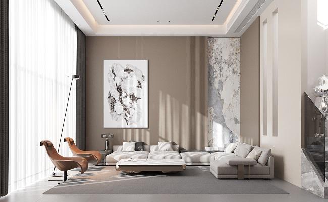 空間以開闊格局勾勒大氣輪廓,大理石的清冽與織物的溫軟細膩交織,在碰撞中蘊生豐富層次;筒燈似有似無地點綴其間,為整體暈染出一層溫潤而雅致的柔光。