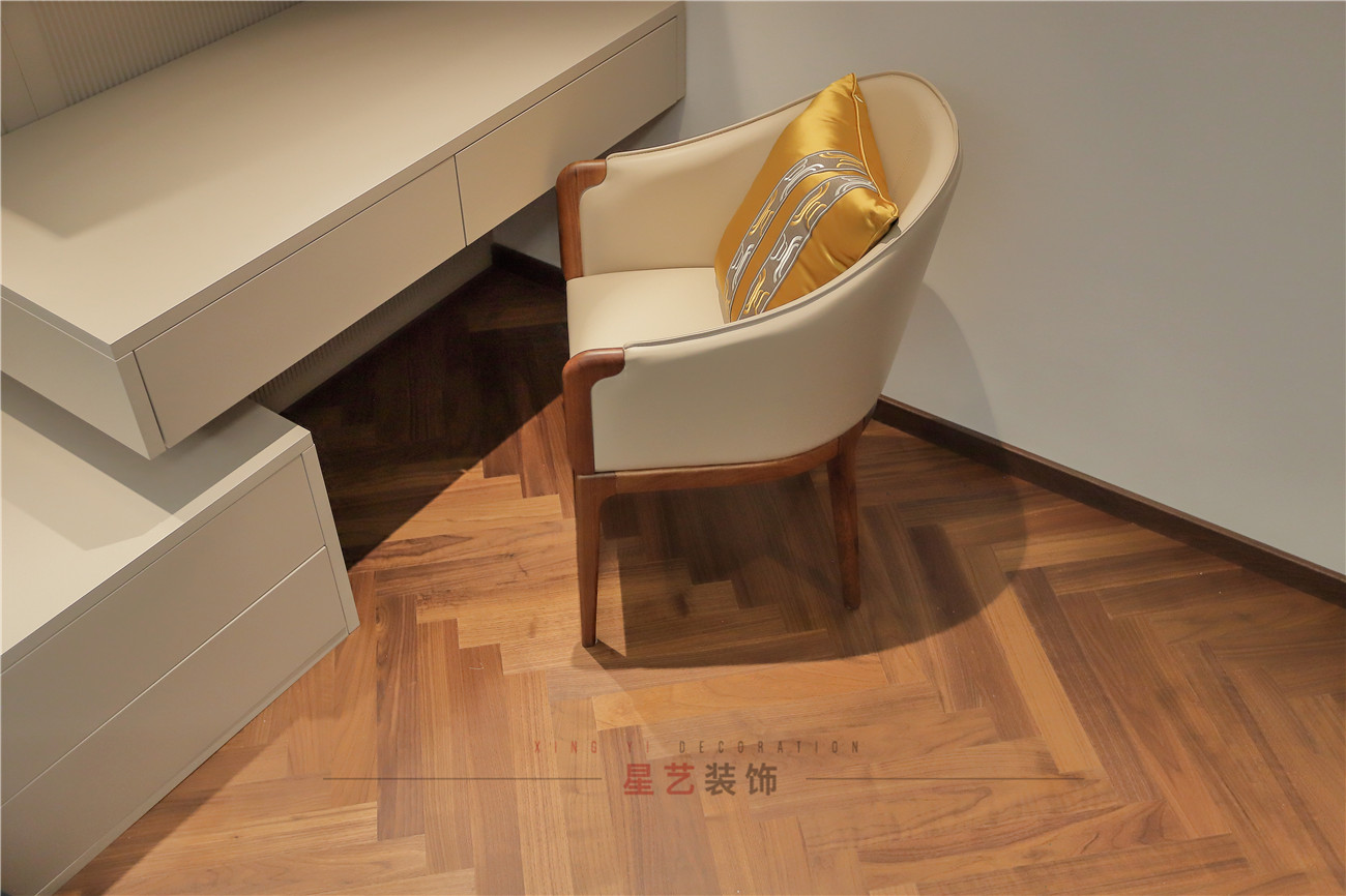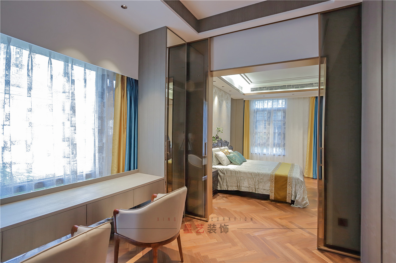 臥室用豐富的色彩搭配營造了一個溫馨舒適的環境,若隱若現的山水背景墻和枝椏圖案仿佛處在春意盎然的環境中,感受自然的勃勃生機。旁邊就可以作為化妝間,屬于愛美女性的小天地。