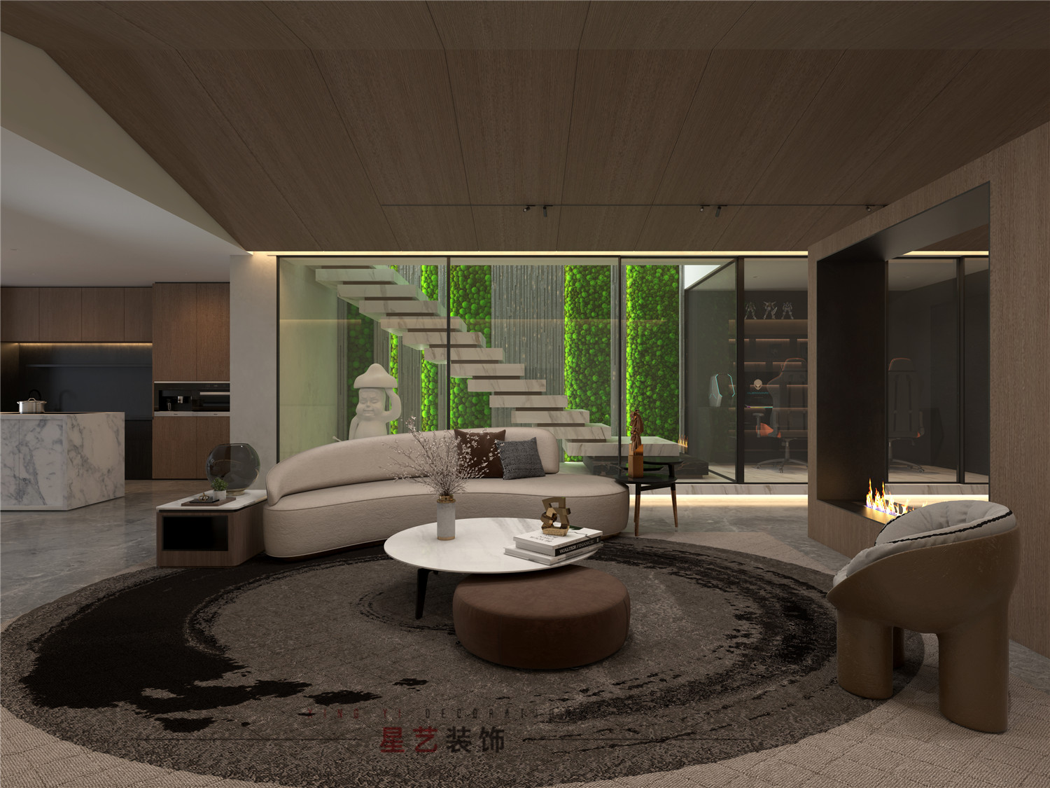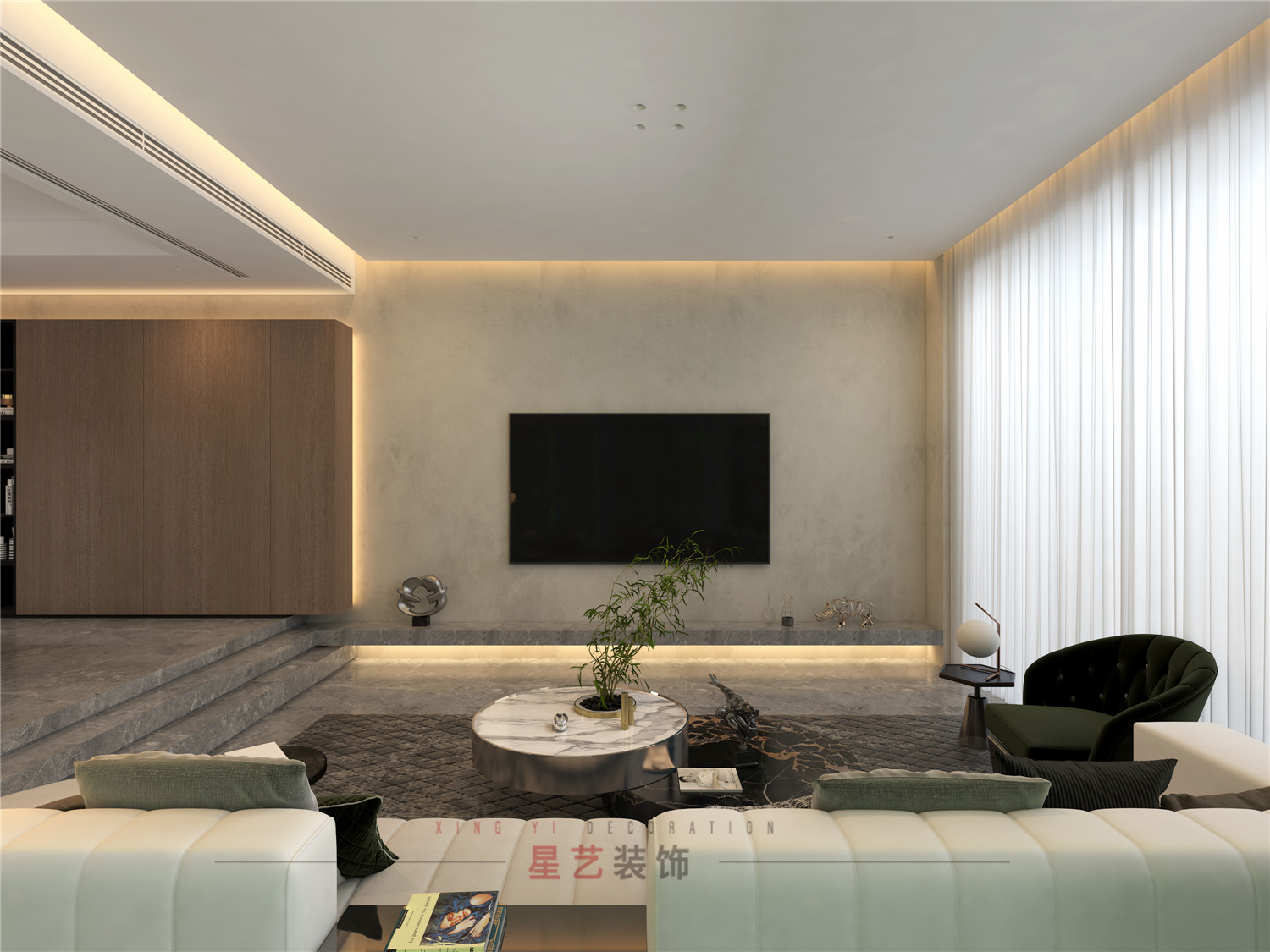 綠植裝飾貫穿兩層客廳的背景;