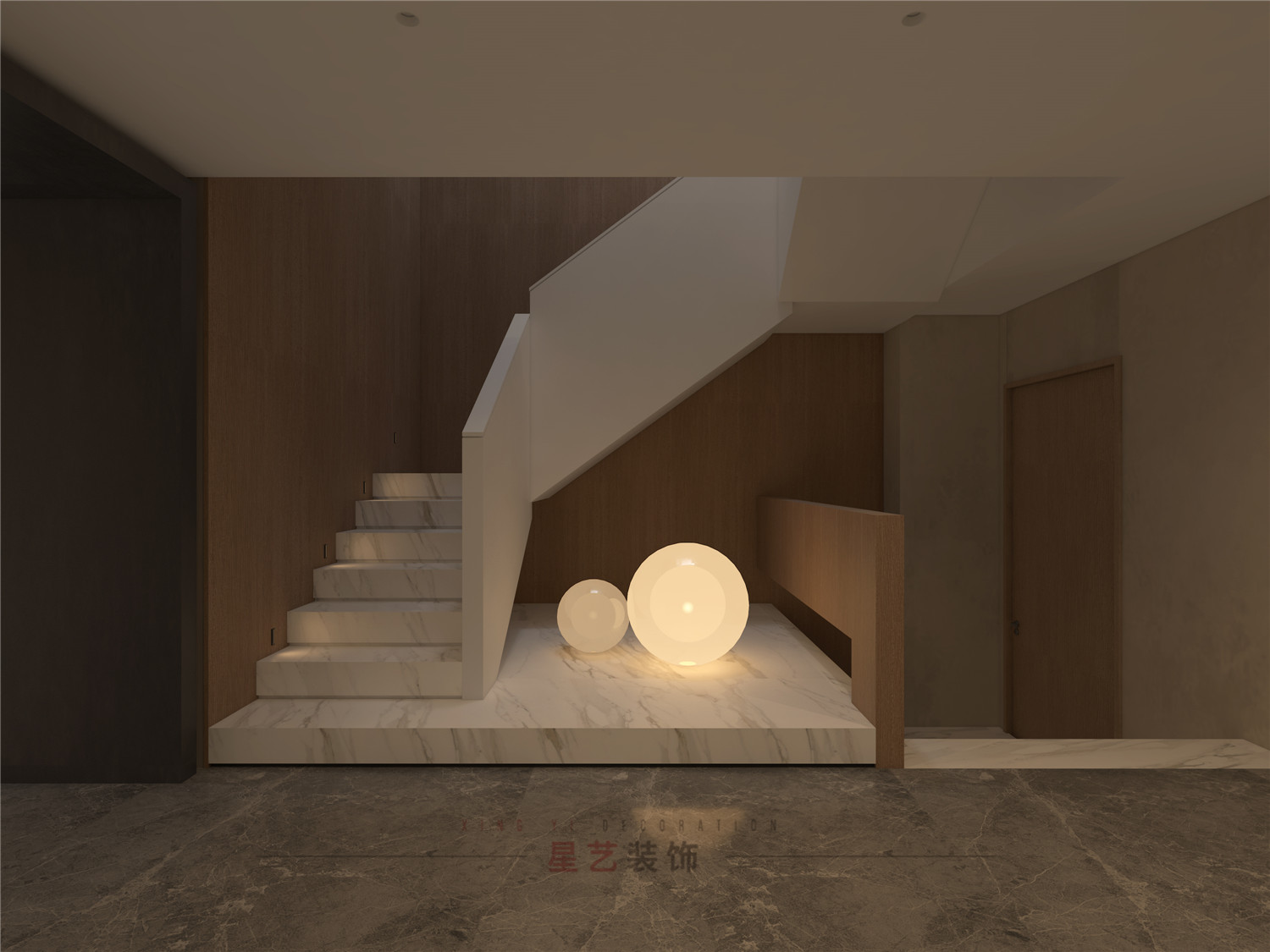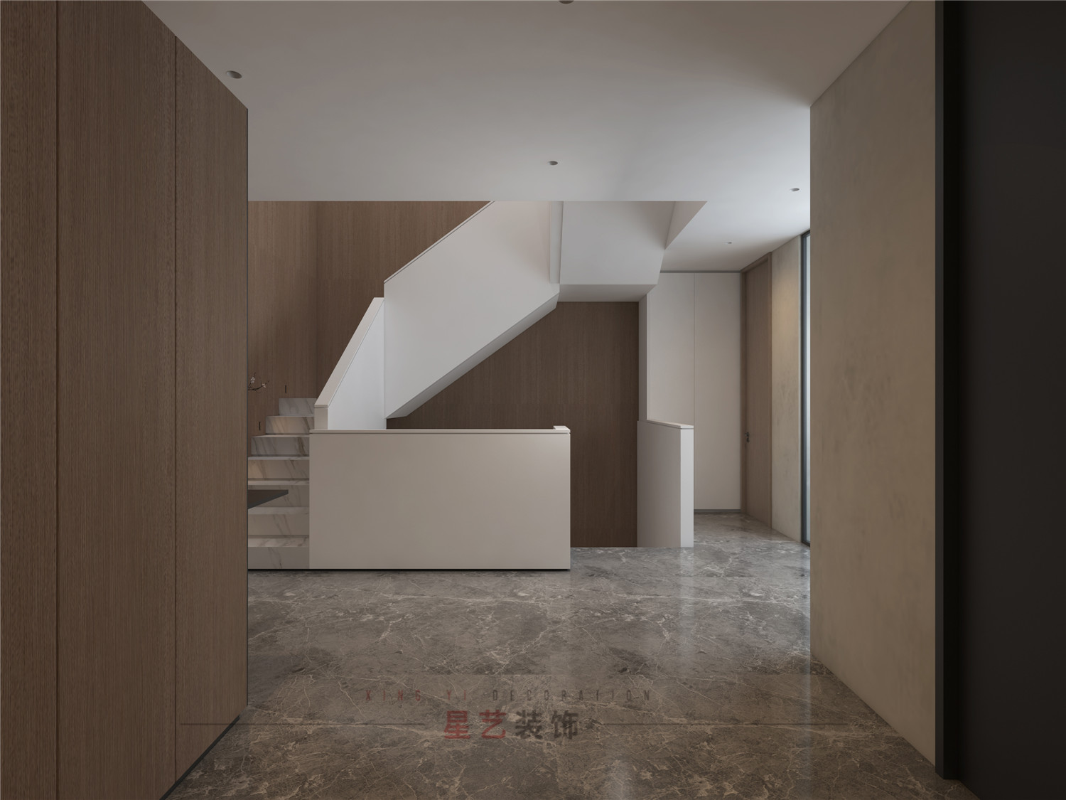 從玄關(guān)處用不同深淺的胡桃木配合黑白灰,